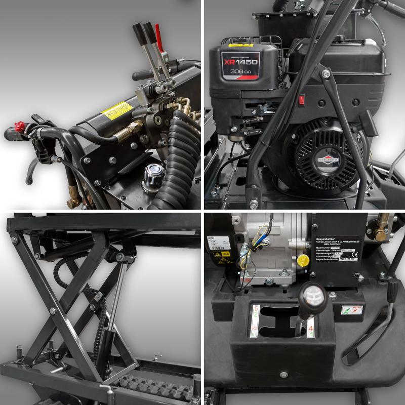 Den RD-300pro är självgående och tråget kan lutas hydrauliskt. För detta ändamål finns en kraftfull hydraulisk enhet och hydraulcylinder på maskinen. Lutningssystemet ökar arbetsytorna och du kan ladda en mängd olika material med en max vikt på 500 kg direkt i t.ex. släpvagnen eller lastbilen. RD-300pro är utrustad med en hopfällbar fotbräda så att föraren säkert kan stå på maskinen och åka med den.