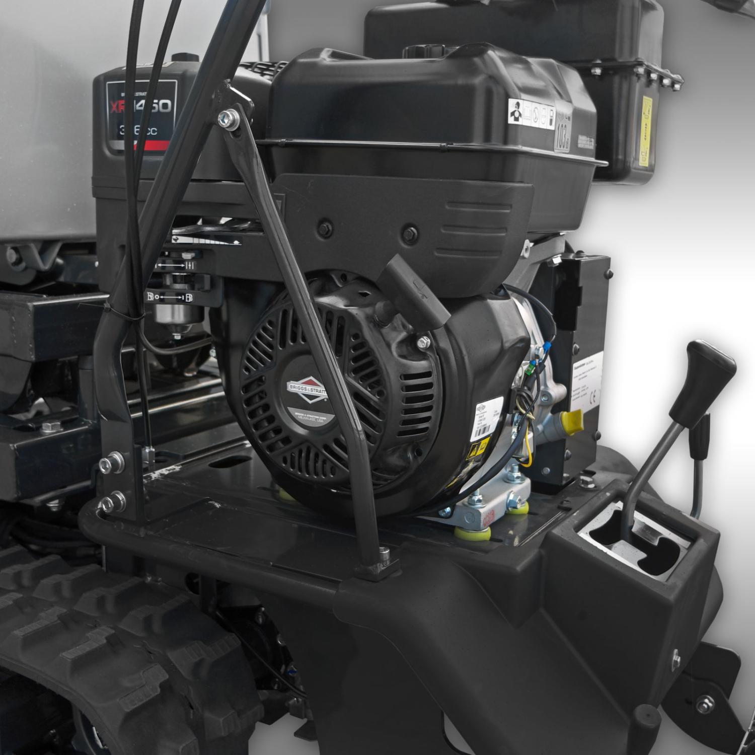 Tack vare kedjedriften och markfrigången på cirka 120 mm är denna dumper lämplig för särskilt tuff terräng. Lutningar är inga problem heller, men notera dumperns högre tyngdpunkt! RD-300pro levereras med en högkvalitativ 9 hk bensinmotor från Briggs & Stratton. Dessa är robusta, pålitliga och effektiva. Motorn startar mycket bra (även vid låga temperaturer) och kan startas med en dragstarter.
