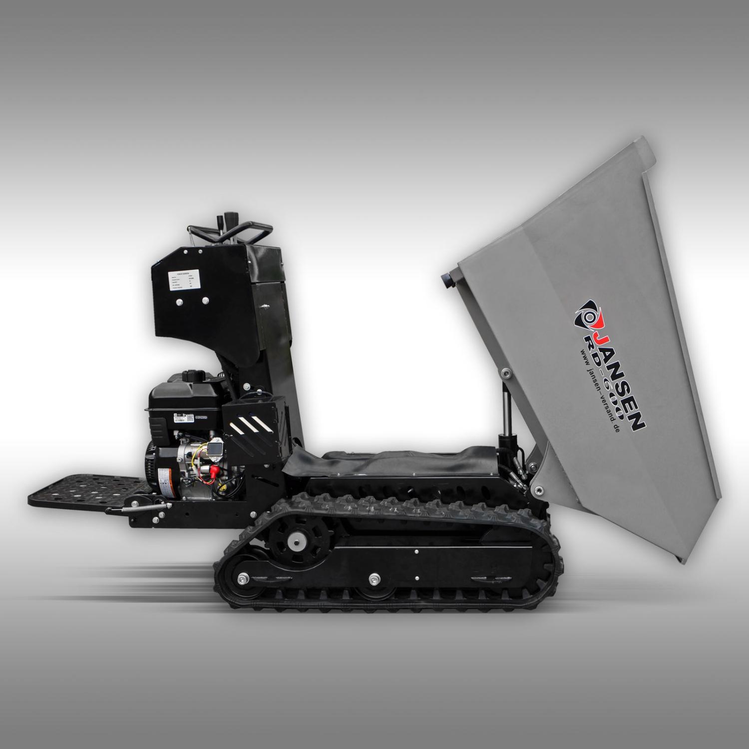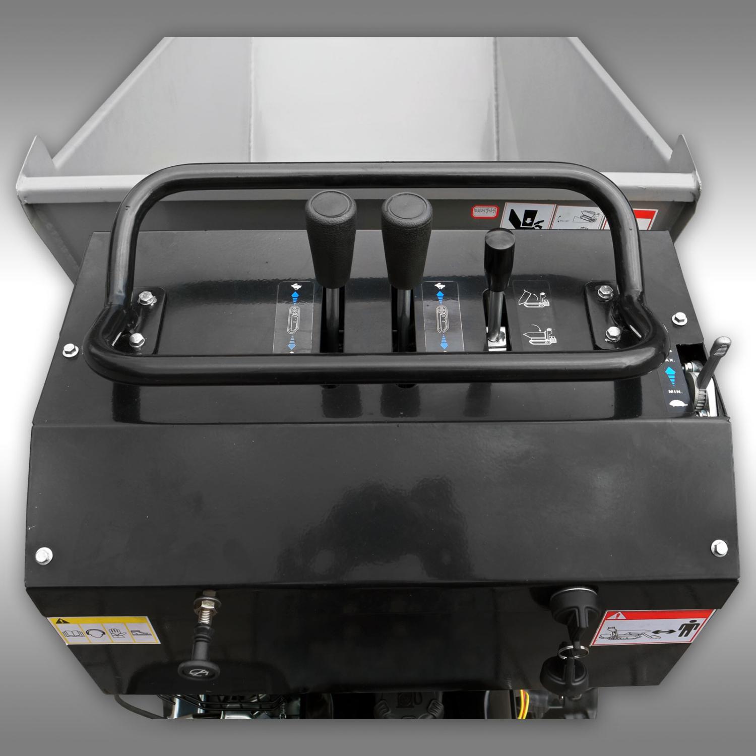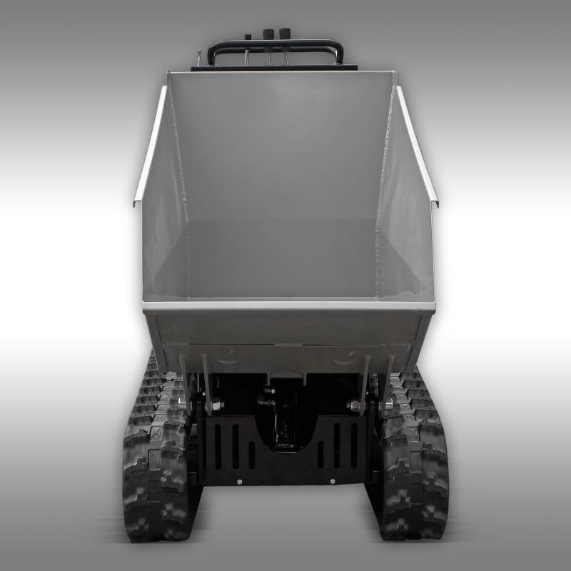 Larvdumpern är självgående och tråget kan tippas. För detta ändamål finns en hydraulisk enhet och en hydraulcylinder på maskinen. Med denna funktion skiljer sig vår minidumper från andra! Lyft- och sänkprocessen tar några sekunder. Tråget har en maximal storlek på 133 x 62 x 68 cm.