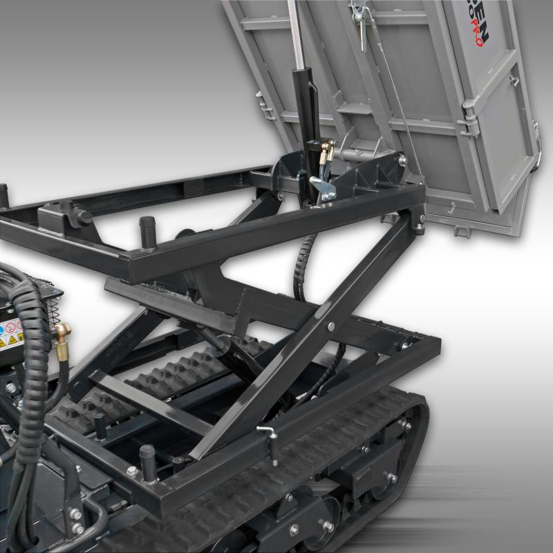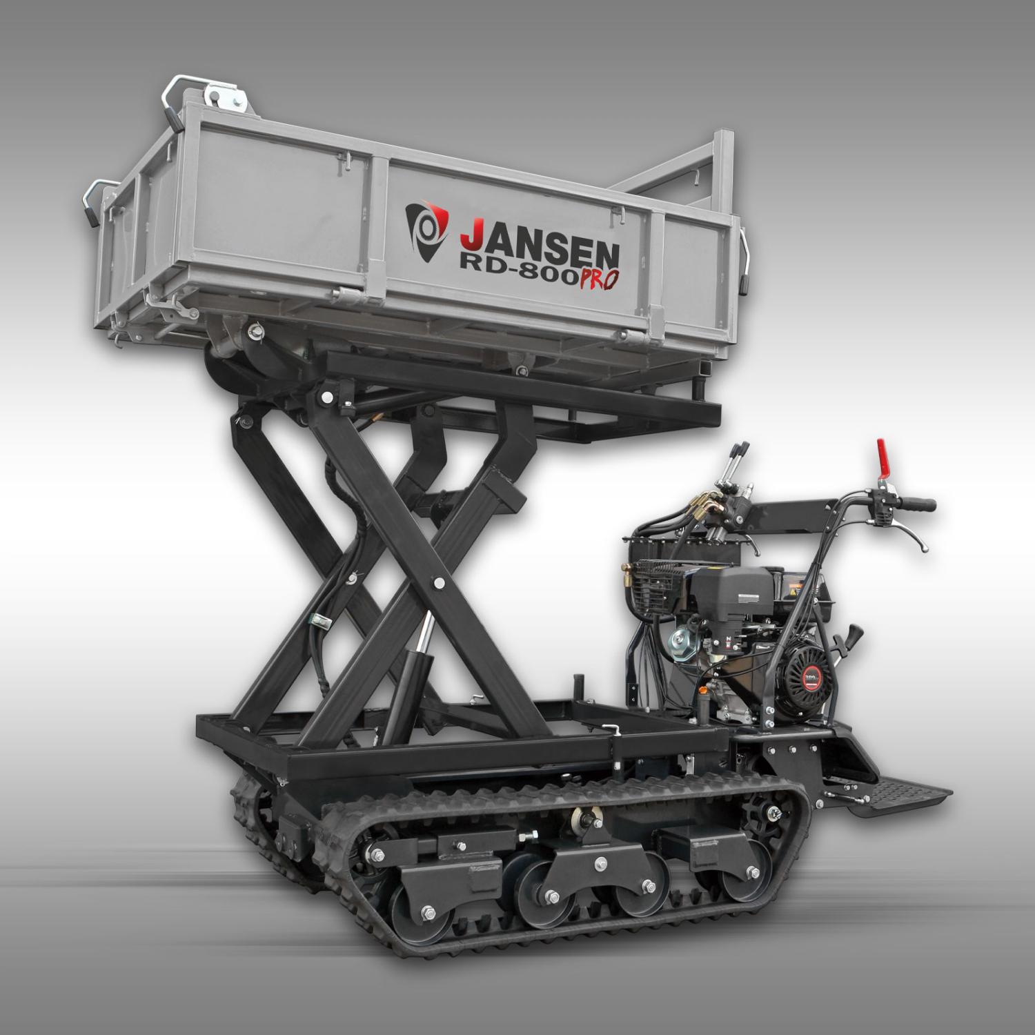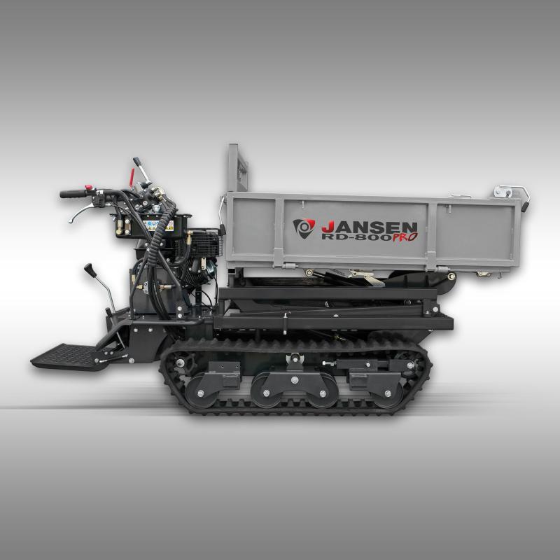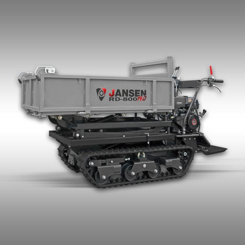 Vår Jansen® RD-800pro banddumper är en variant av Jansen® RD-800 och har ett hydrauliskt högtippsystem. Det är ett flexibelt kraftpaket och kan användas på många olika sätt. Tack vare det kraftfulla hydraulsystemet kan du enkelt dumpa tunga laster med en lyftkapacitet på 1000 kg. Jansen® RD-800pro ger värdefulla tjänster, även i tuff terräng tack vare larvband.