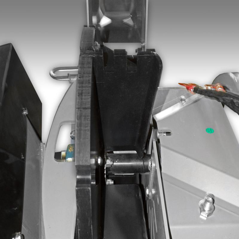 Maskinen är konstruerad för att vara underhållsvänlig; så att du kan öppna hela svänghjulskåpan genom att lossa bara en skruv, vilket ger dig tillgång till de fyra skärbladen. Dessa skärblad är dubbelsidiga så att de enkelt kan vändas om vid slitage. Svänghjulet har en diameter på cirka 90 cm och en nettovikt på cirka 120 kg och har monterade blad, vilket ger den otroligt kraftfulla sugningen som i slutändan driver fliset ur utmatningstratten. Tack vare detta kraftfulla luftflöde är blockering av flishuggen praktiskt taget omöjlig.