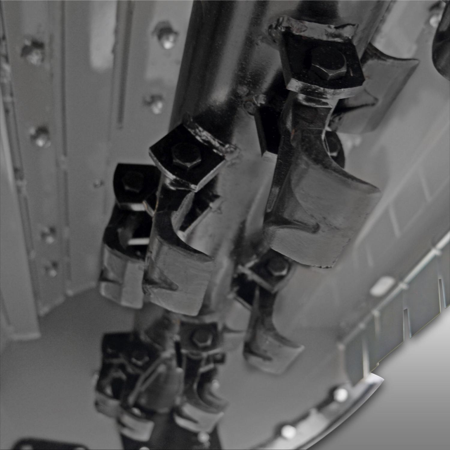 Fritt svängande lameller framtill förhindrar att stenar kastas ut