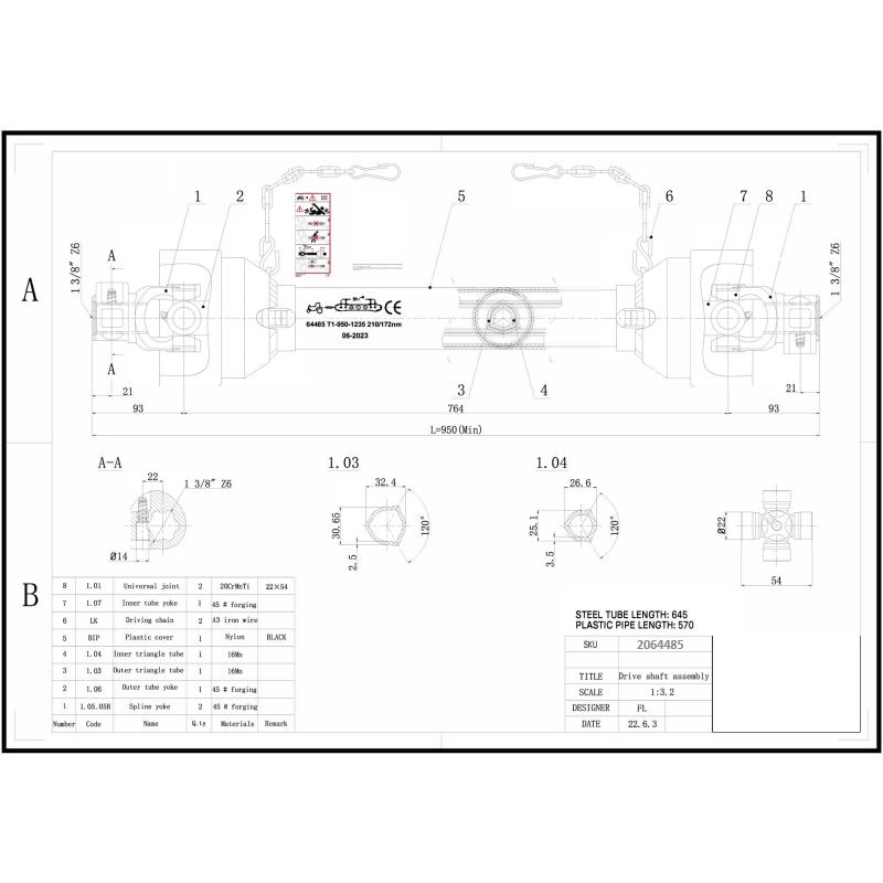 - Anslutning 1 (traktor): 1⅜″, 34,9 mm, 6 tänder