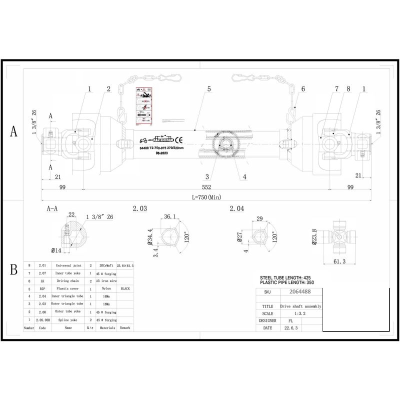 K-axel T2 750-975mm 270Nm 540 varv/min, 23kW (31HK), kardanaxel