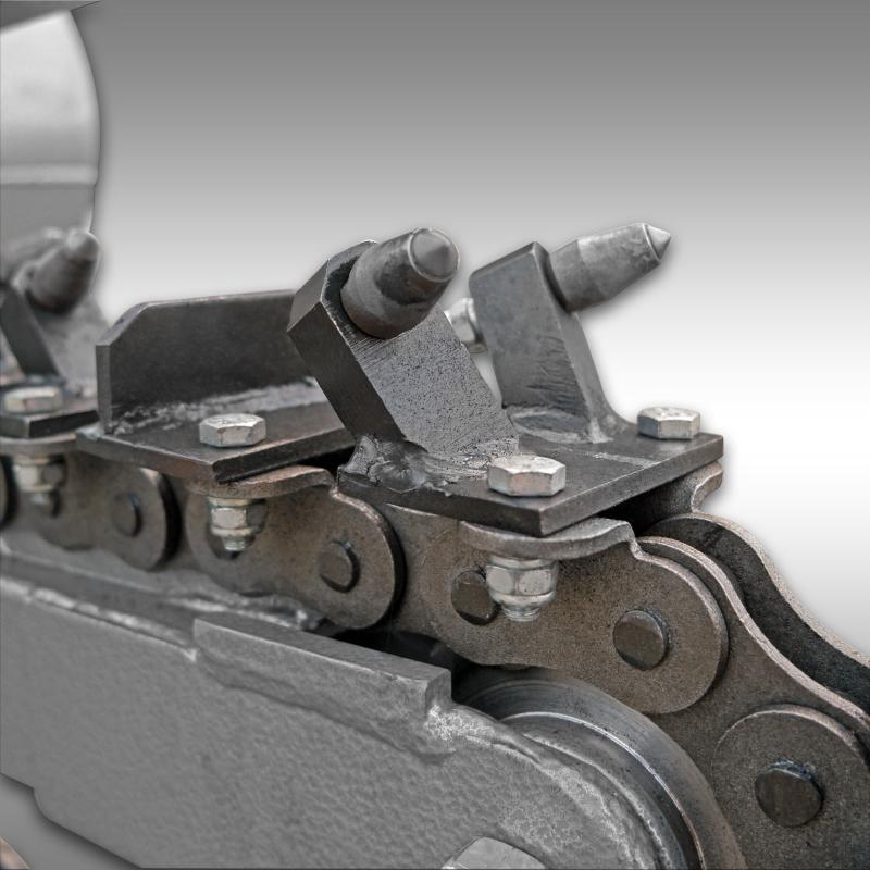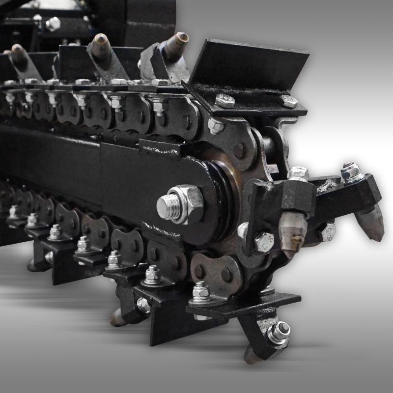 Fräskedjan med de 27 fräsbladen av karbidmetall är skruvade på den robusta gravkedjan och kan bytas individuellt. Det långa svärdet möjliggör ett maximalt fräsdjup på 60 cm. Det utgrävda materialet flyttas åt sidan och därmed blir en arbetshastighet på upp till 60 m per timme möjlig.