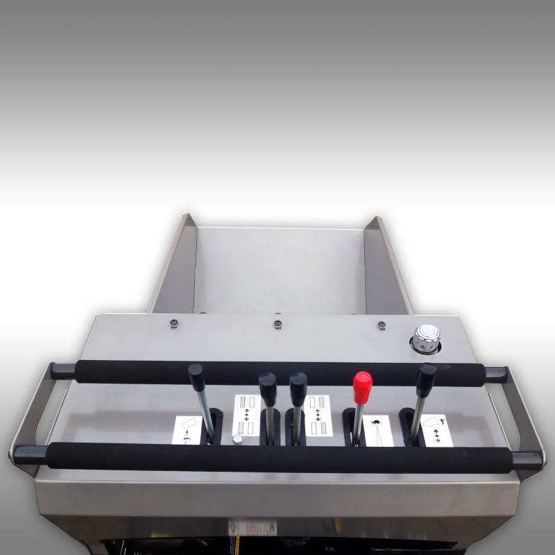 Lyft- och sänkningsrörelserna sker inom några sekunder. Vi levererar en kraftig version av maskinen med ett förstärkt tippflak (materialtjocklek 3 mm). Tippflaket har följande dimensioner: