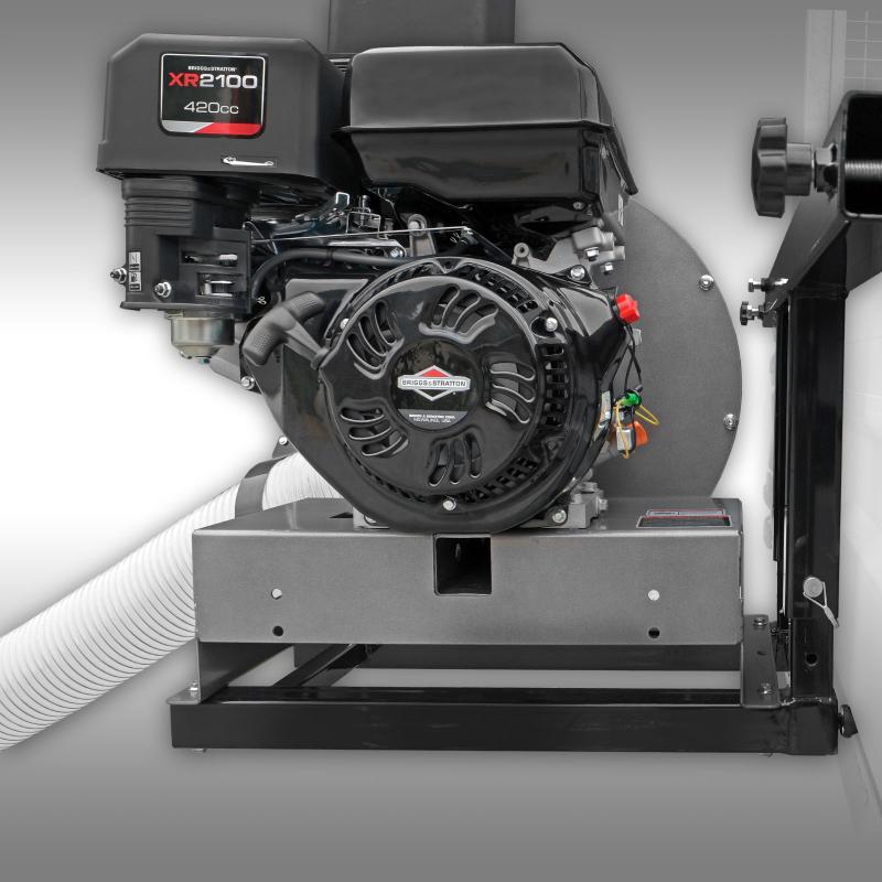 Den pålitliga och starka 13 hk Briggs & Stratton bensinmotorn driver det kraftfulla turbinhjulet som är placerat i ett stabilt hus. Turbinhjulet har en diameter på Ø 400 mm och är försett med 4 stora och 4 små blad som säkerställer att sugmaterialet krossas och komprimeras till ett minimum. Apparaten har en sugeffekt på ca 3800 m³/h.