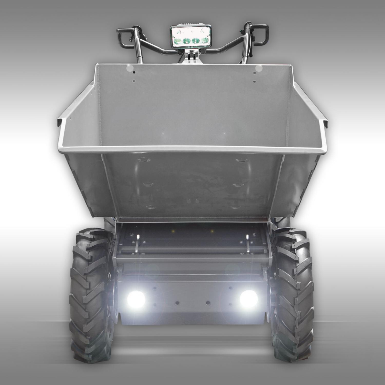 Lastvolymen är ca 150 liter, den maximala lasten är 300 kg. Även lutningar upp till maximalt 15° är möjliga när den är lastad! Tack vare de fyra inbyggda hydrauliska skivbromsarna kan skottkärran hanteras säker och enkel i nedförsbacke också.