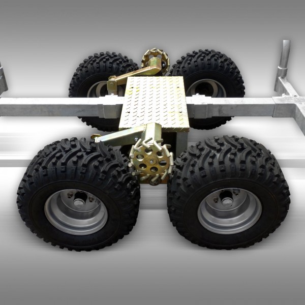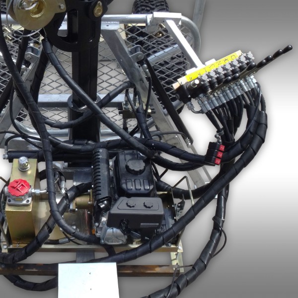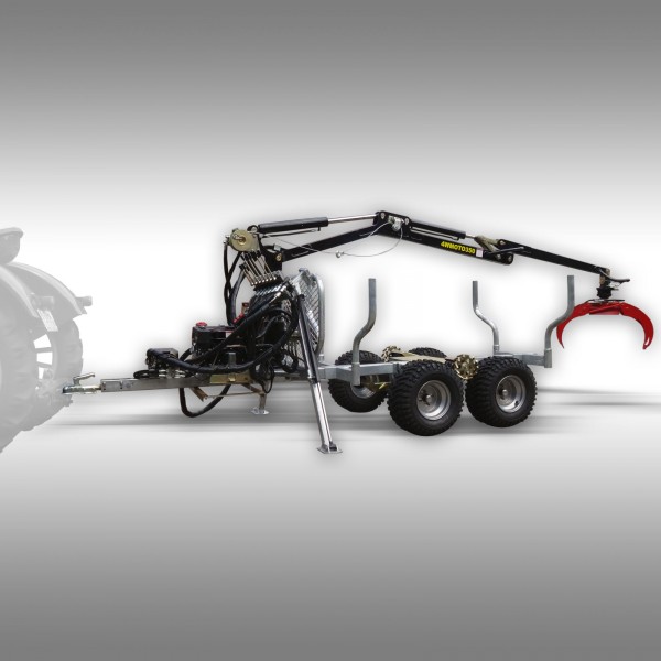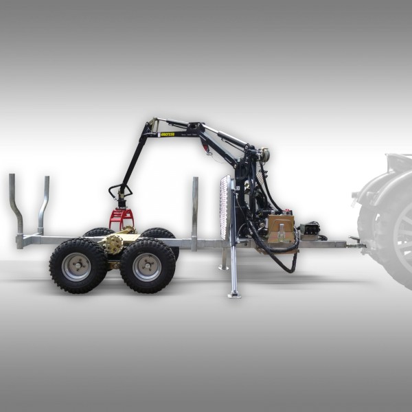 Hydraulikenheten kommer som en del av leveransen och drivs med en 6,5 hk 4-takt bensinmotor. Kabelvinschen drivs hydrauliskt och kan manövreras via fjärrkontrollen, vilket gör det lättare att lyfta delade stammar då du kan stå direkt bredvid och använda vinschen med fjärrkontrollen. Vinschens stålvajern har en längd på 18 meter med en diameter av 5 mm. Vagnen kan enkelt flyttas med dragstången. Många av våra kunder bogserar släpvagnen med en ATV (fyrhjuling eller liten traktor) eftersom den också är mycket flexibel på smala stigar. Vagnen är inte tillåten för transport på allmänna vägar.