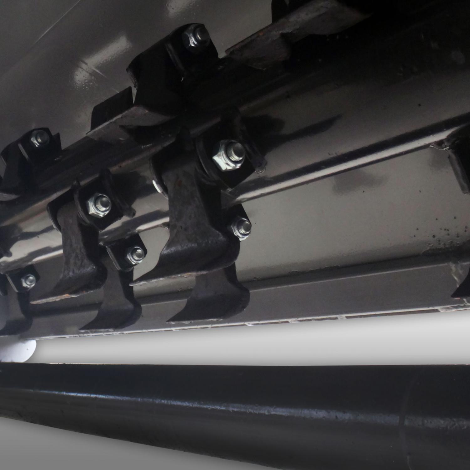 Denna slyröjare har den tyngsta växellådan i sin klass. Till skillnad från andra slaghackar utrustade med lätta Y-knivar, har denna slåttermaskin de bästa prestandaegenskaperna tack vare den höga svänghjulsmassan, tunga hammarslagor och den tyngre axeln. De 20 speciellt härdade hammarslagor, som väger 0,4 kg, strimlar klipporna till ett minimum.