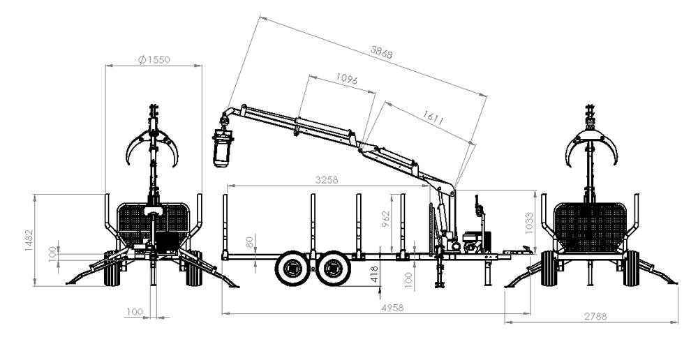 Kranen som ingår i leveransomfånget har ett svängradius på 180 grader och en maximal räckvidd på 3,8 m. På den maximala räckvidden av 3,8 m har den en lastkapacitet på 200 kg och vid 1,5 m bär kranen 300 kg. Kranen har en hydraulisk grip som kan rotera 360 grader.