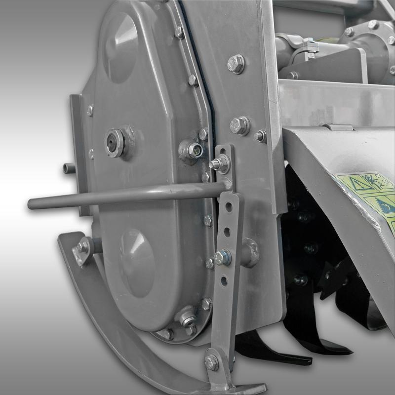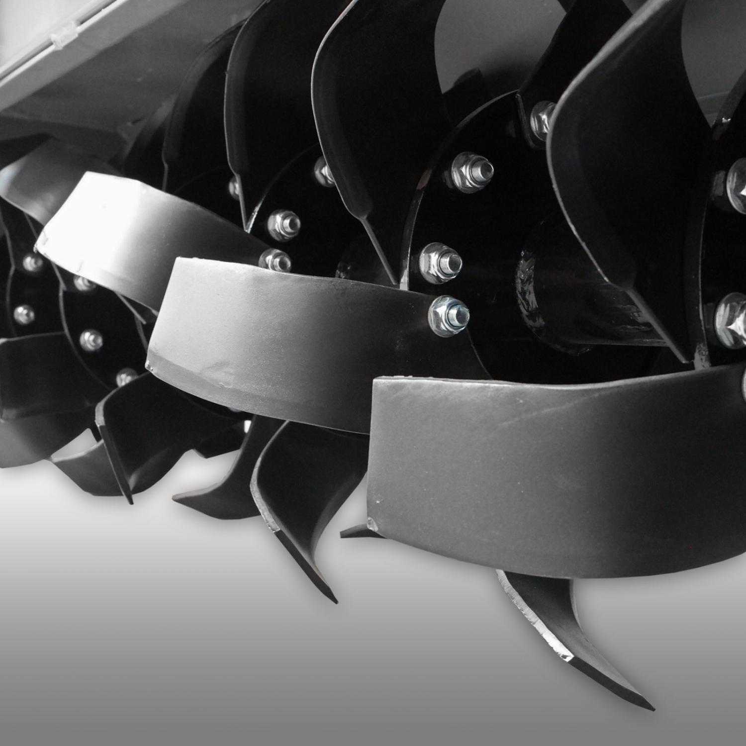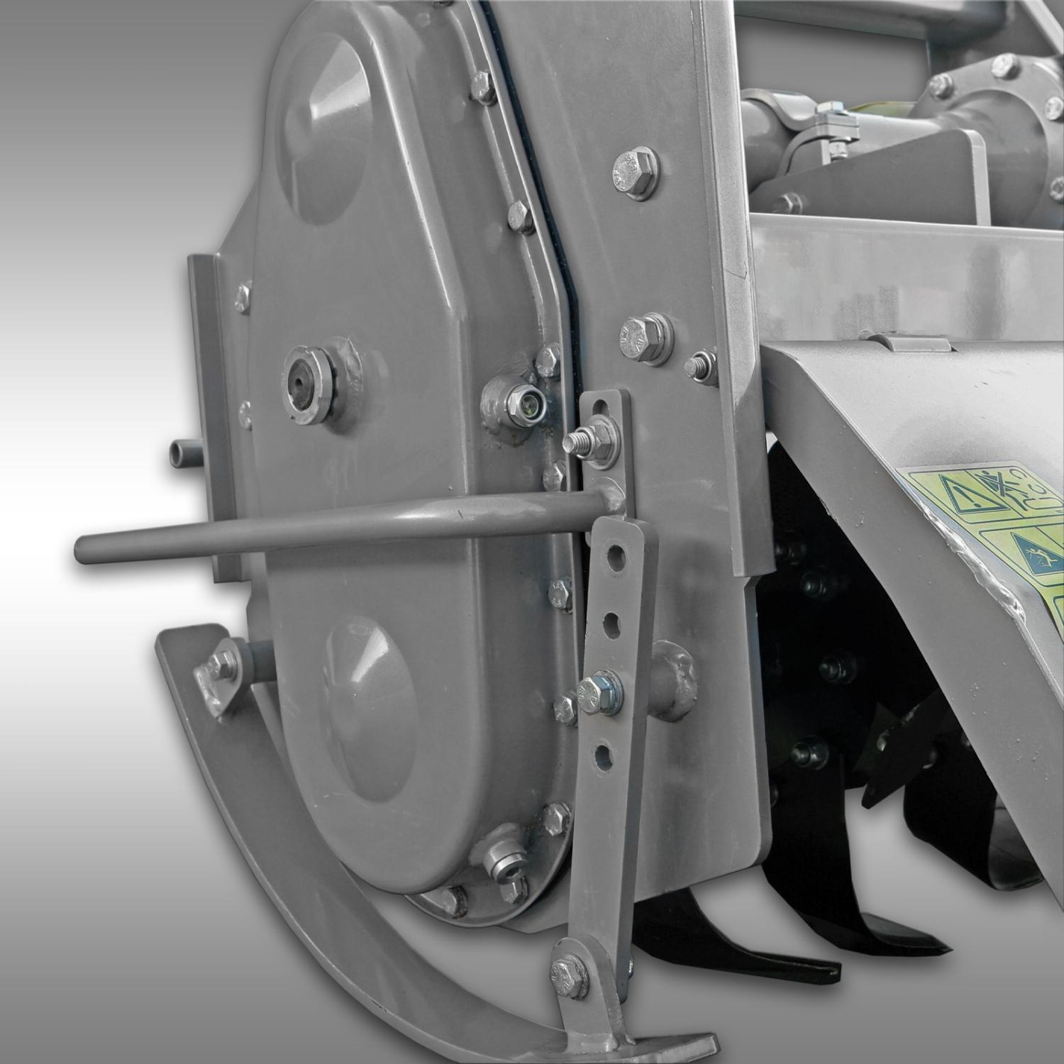 Arbetsbredden är ca 125 cm och fräsdjupet är max 16 cm. Detta kan justeras med hjälp av sidolisterna. De robusta skärbladen är fästa på den stabila rotoraxeln. Kultivatorn drivas av kraftöverföringsaxeln som ingår i leveransen och hängs i trepunktslyften på din traktor (kat. I och kat. II).